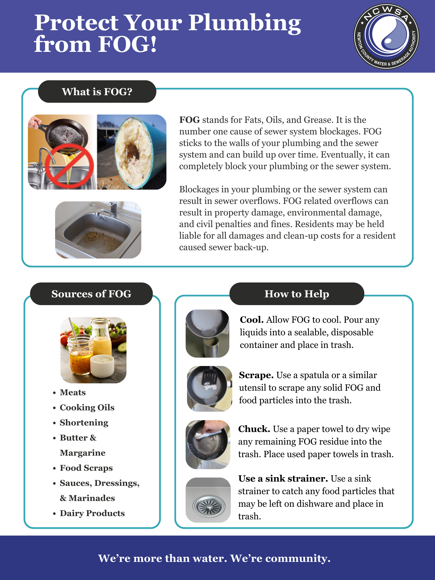 Fat, oil, and grease in sewer pipes, referred to as FOG, create pollution problems in many communities. FOG enters sewer pipes through restaurant, residential, and commercial sink drains. Once in the sewer, FOG sticks to the pipe and thickens. FOG can build up and eventually block the entire pipe. Blockages in sewer pipes can send sewage backward – out of manholes into streets and rivers, or up floor drains in homes. These sewage overflows pollute the environment.